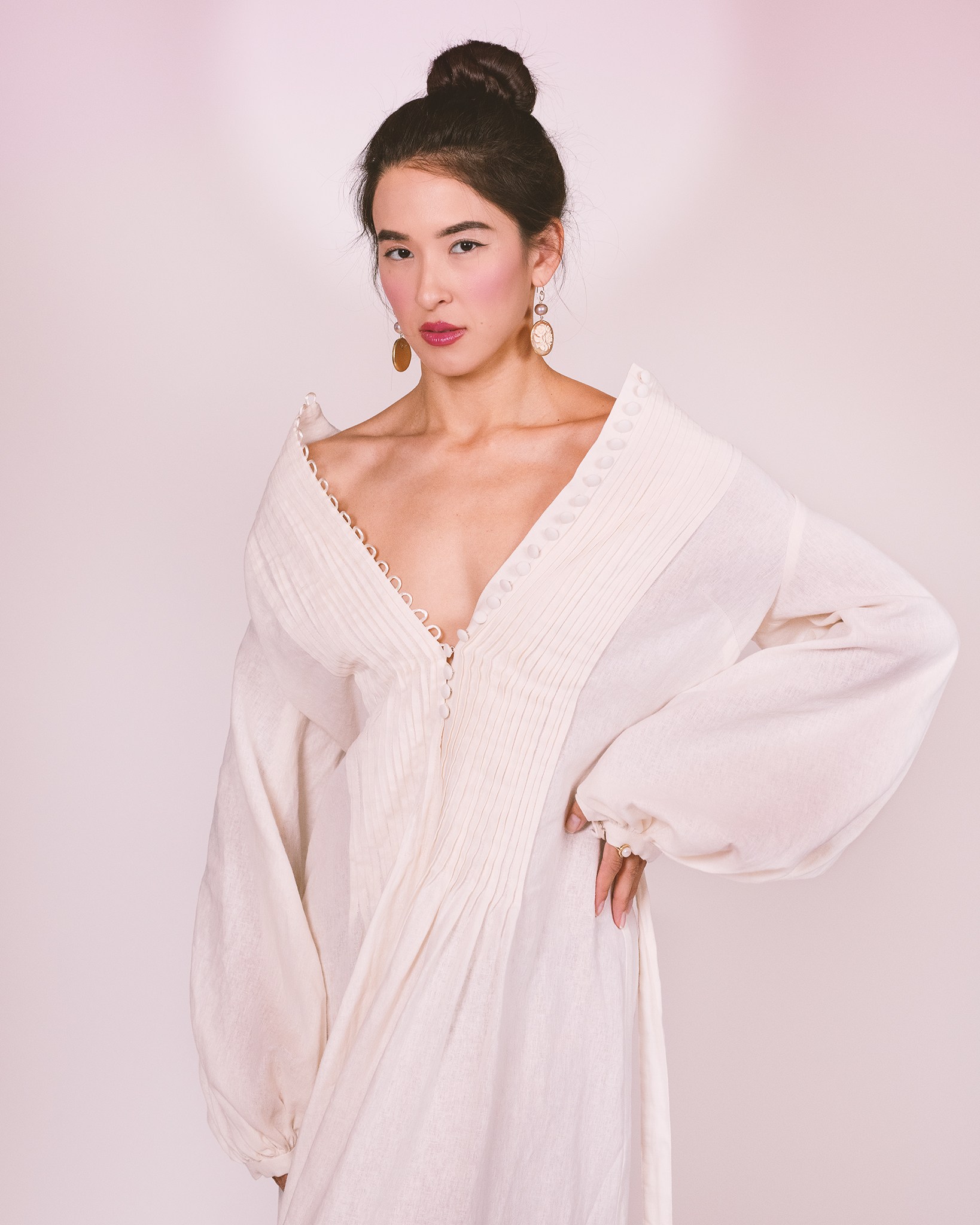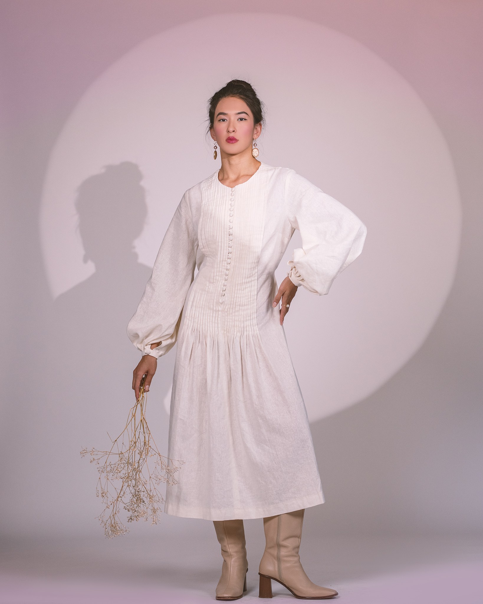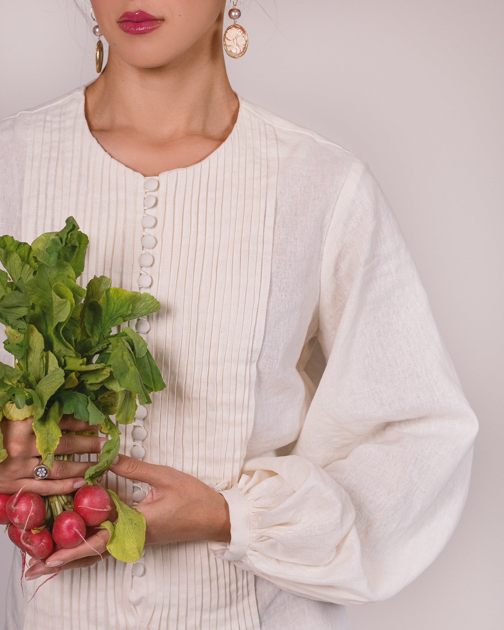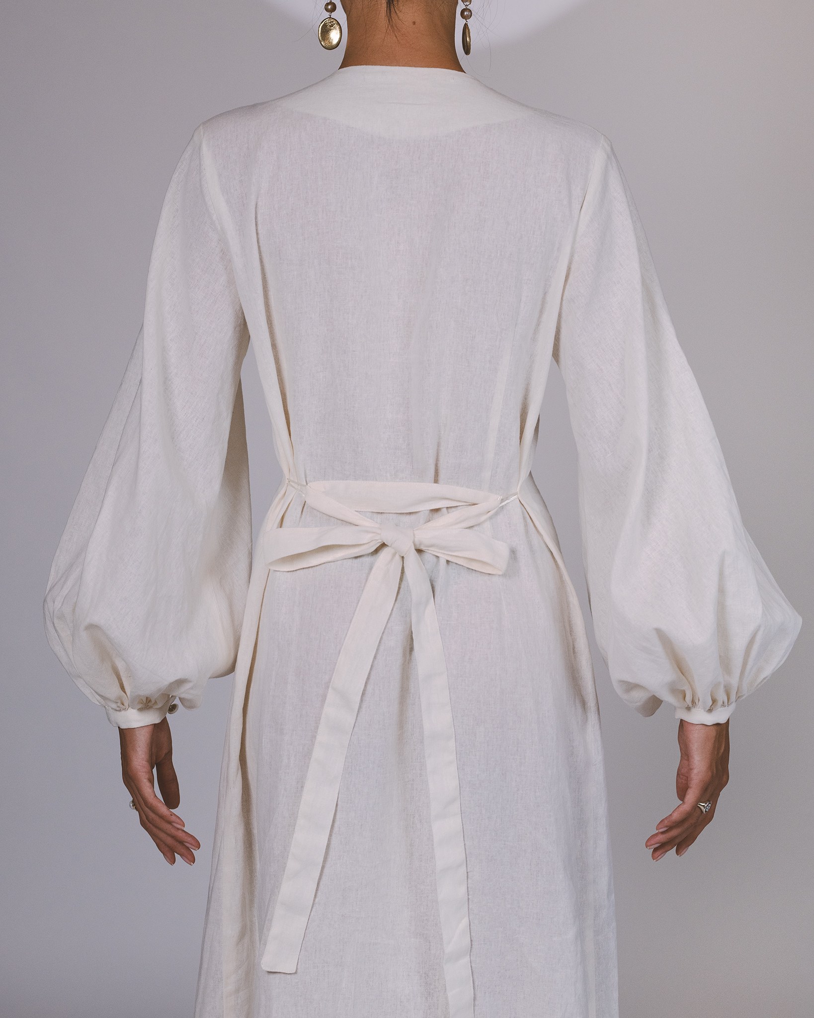 Button-fastening (or Button-up) to the waist, with balloon sleeves.
